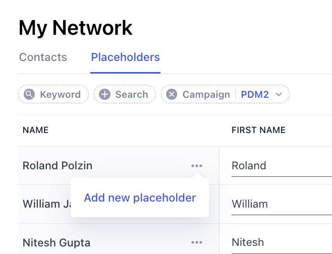 To create a new placeholder, you should go to the menu My Network on your left. Then select a Placeholders tab.